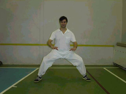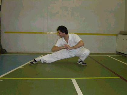 избежать травмы. Когда ноги достаточно разогрелись, переходим к более глубокому и избирательному разогреванию. Сначала греем внутренние и задние мышцы бедра (приводящие и сгибатели). Глубокая и очень широкая стойка наездника, носки в стороны. Важно почувствовать, что нагрузка идет не на передние мышцы, а на внутренние и задние мышцы бедра! Если нагружаются бедра только спереди, это не эффективно! Делаем глубокие качания сначала в медленном, потом быстром, потом снова в медленном темпе. Дышим. Концентрируемся. Мышцы должны устать и разогреться. Совершаем наклоны к выпрямленной ноге Тянем задние мышцы бедра. (Можно ставить ногу на высокую опору, например перекладину шведской стенки. Но это уже отдельная группа упражнений). Помогаем силой рук и весом тела. Балансируем на грани боли и удовольствия, ходим туда-сюда. В результате этого упражнения тянется массив задних мышц бедра, и частично голени. Упражнение имеет традиционное название - ”Шаг верхом на драконе”. Во времена Культурной революции называлась ”Высматривать воров, ворующих общественный рис”! Тянем преимущественно передние мышцы бедра. 4б - более продвинутый вариант, позволяет тянуть и ближайшую к туловищу часть задних мышц бедра. Носок ноги, стоящей впереди, можно разворачивать наружу. Категорически не рекомендую разворачивать носок тем, кто имел травму мениска или связок коленного сустава! Нога, стоящая сзади, опирается на носок, разогревается зона ахиллова сухожилия Упражнения 3 и 4 являются ”двигателем” вашей